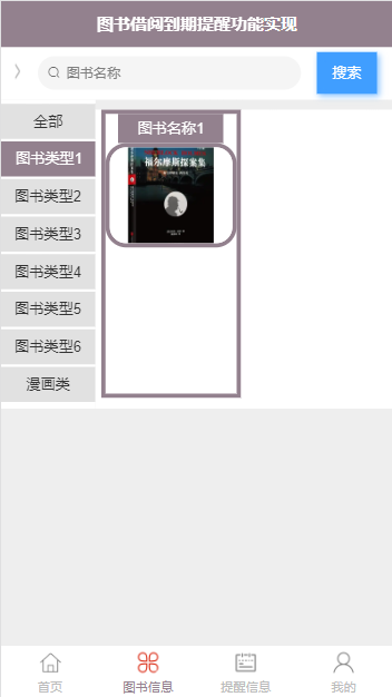用户通过登录进入图书馆借阅到期提醒功能实现,在小程序首页可查看首页、图书信息、提醒信息、我的等内容,在首页还可查看公告信息等