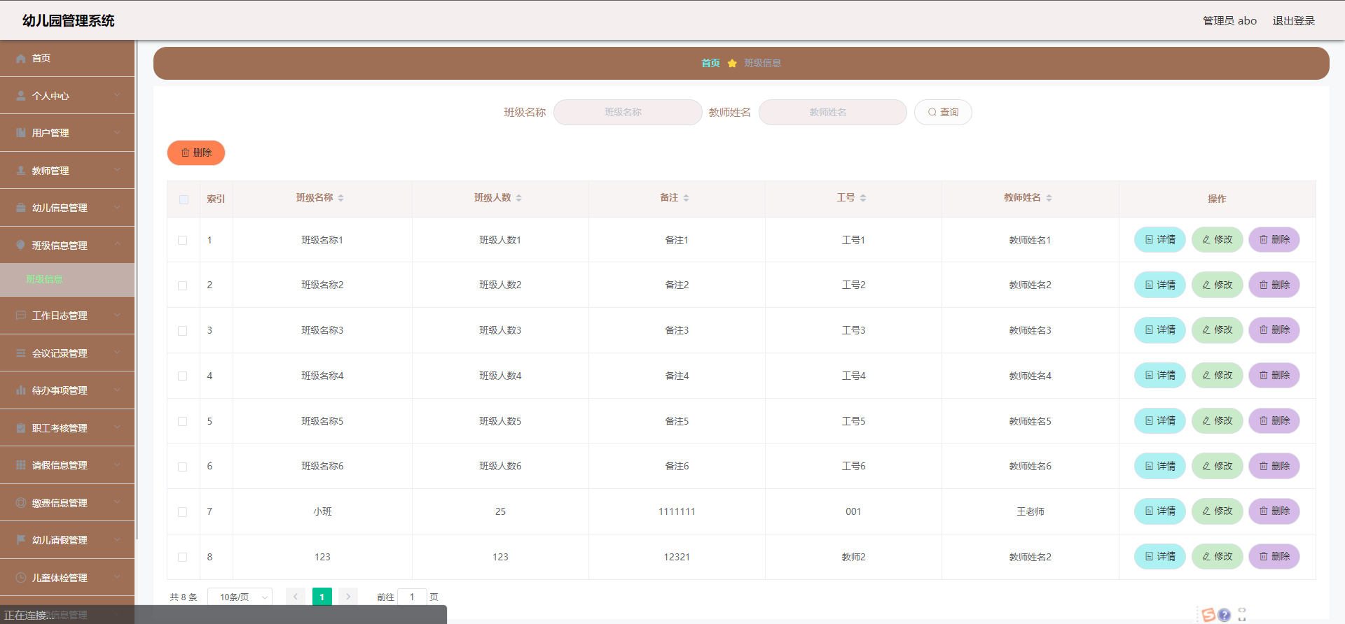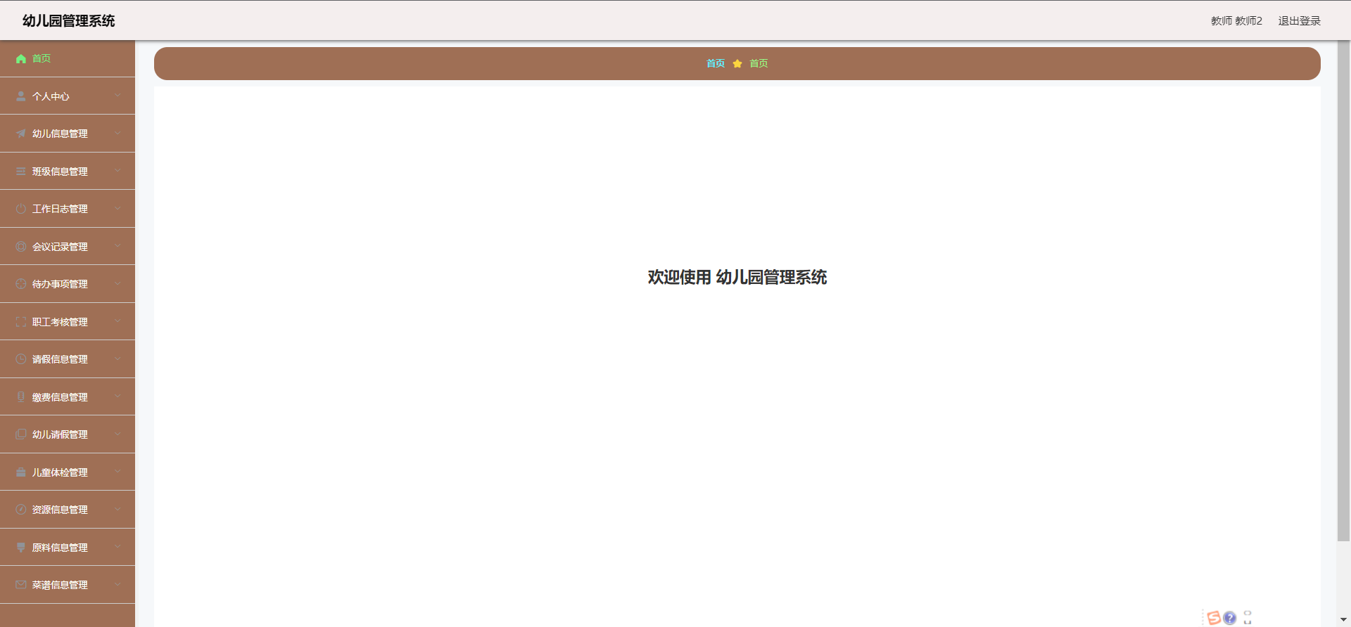 管理员:首页、个人中心、用户管理、教师管理、幼儿信息管理、班级信息管理、工作日志管理、会议记录管理、待办事项管理、职工考核管理、 请假信息管理、缴费信息管理、幼儿请假管理、儿童体检管理、资源信息管理、原料信息管理、菜谱信息管理等