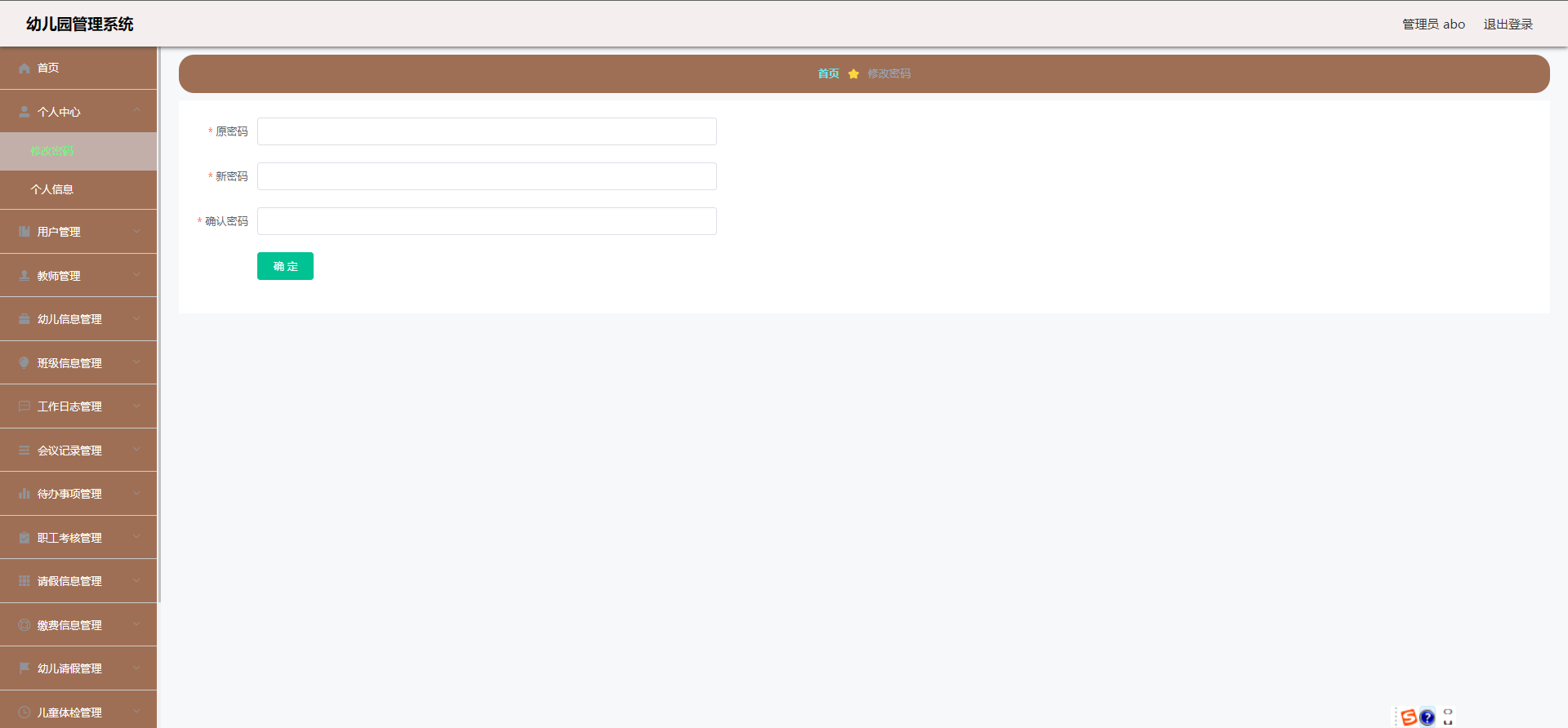 员工:首页、个人中心、幼儿信息管理、缴费信息管理、幼儿请假管理、儿童体检管理、菜谱信息管理等