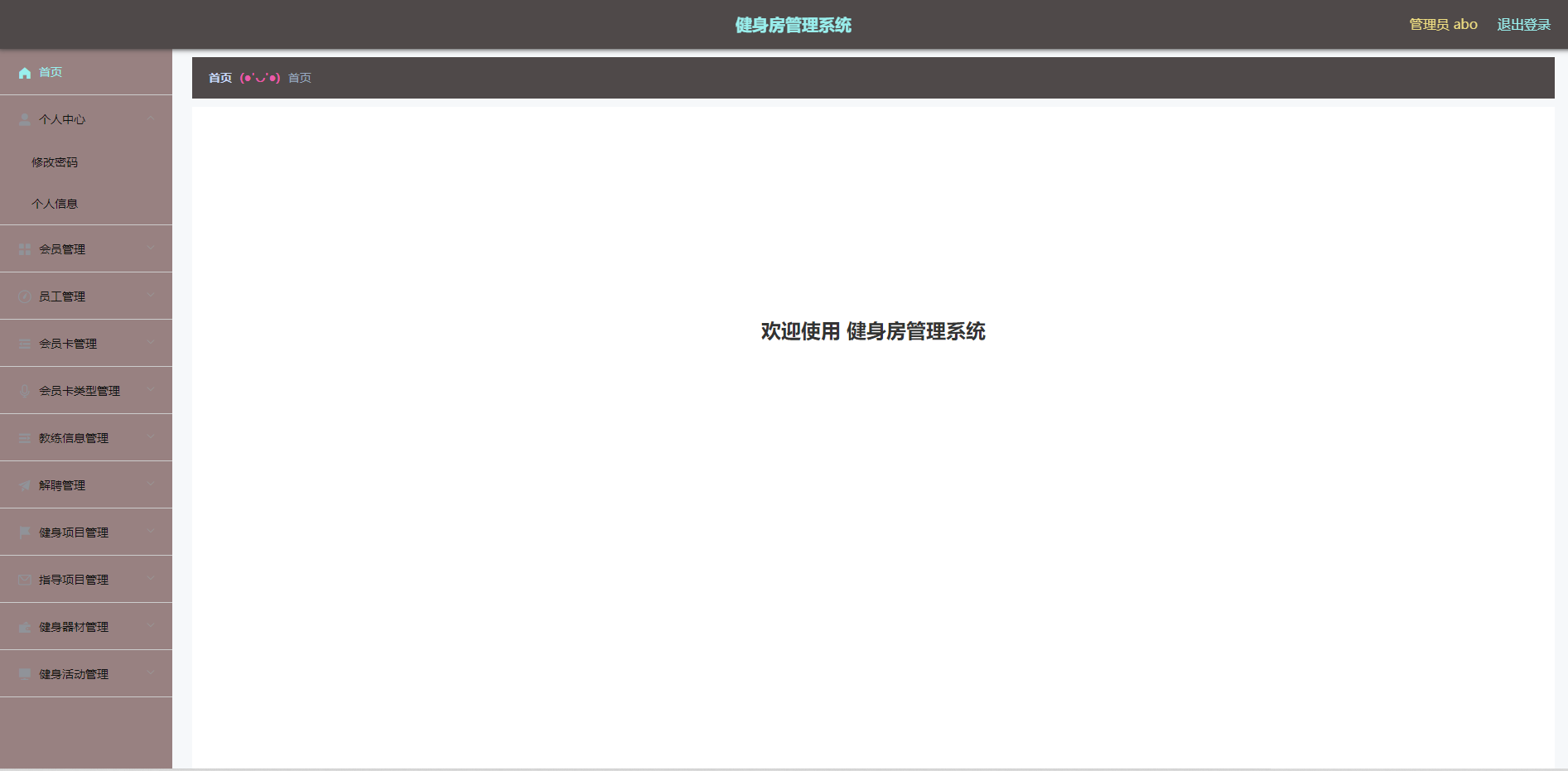 员工: 个人中心、会员卡管理、教练信息查看、健身项目查重、健身器材查看、健身活动查看。