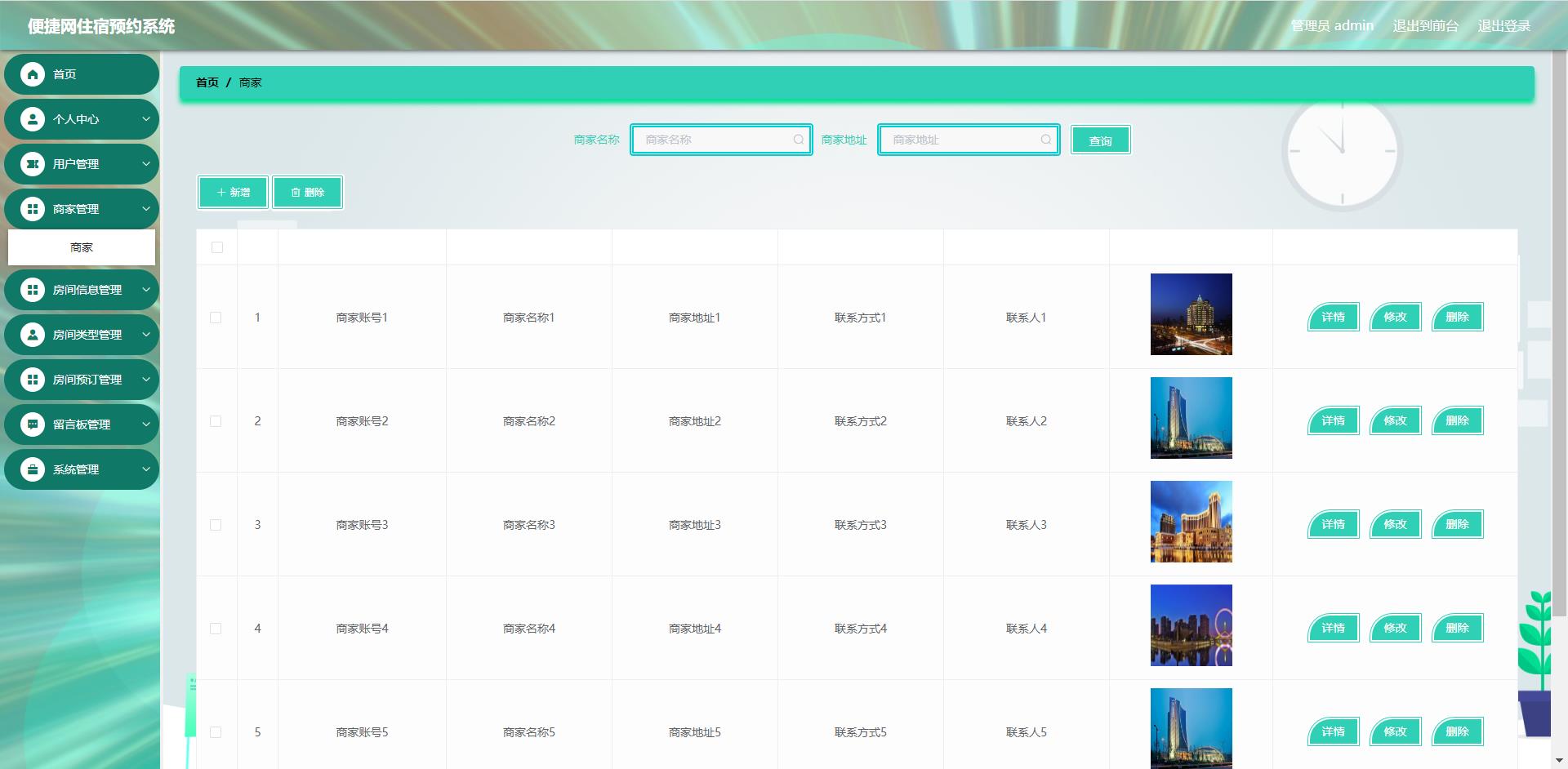 (2)管理房间信息:商家登录便捷网住宿预约系统后,可在进入到后端页面,通过房间信息管理页面进行对房间信息增删改查的操作。