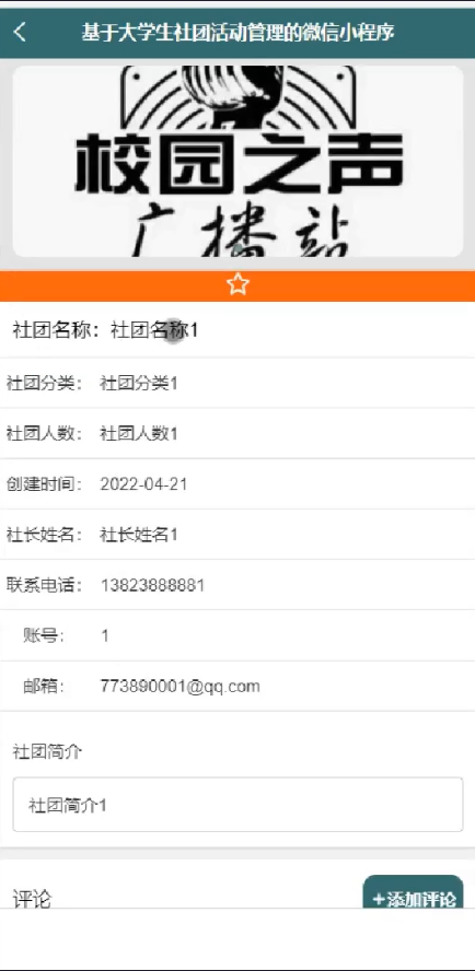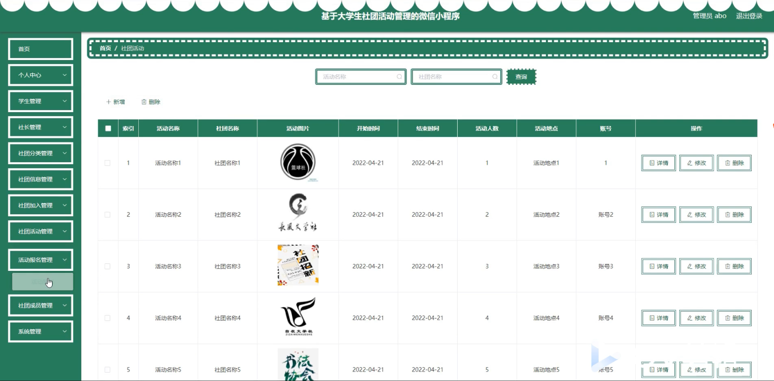 管理员功能有个人中心,学生管理,社长管理,社团分类管理,社团信息管理,社团加入管理,社团活动管理,活动报名管理,社团成员管理,系统管理。 社长和社员都可以在微信小程序上面进行注册和登录。社长可以在微信小程序上面对社团信息进行管理,对社团加入进行审核, 对社团活动进行管理,对活动报名进行审核,对社团成员进行管理。社员可以在微信小程序上面查看和参加社团,查看和报名活动信息等。