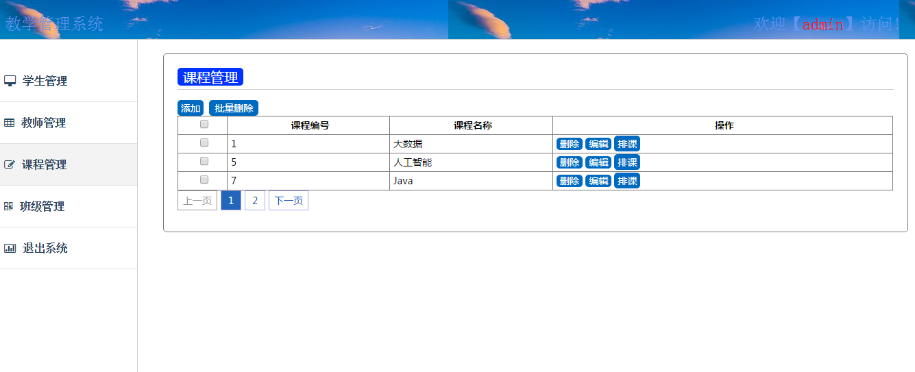 课程管理:主要实现对课程的增加、删除、查询、修改、批量删除、排课等相关操作