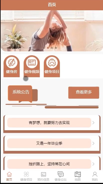 (2)健身项目预约功能,本界面里展示了不同的项目信息,可以选择项目进行预约;