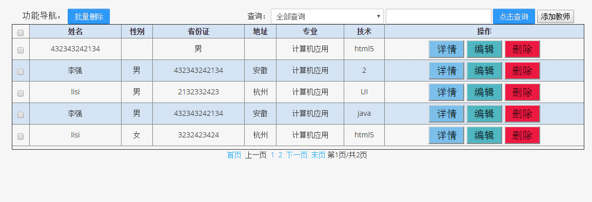 老师管理:主要实现对用户信息的增加、删除、分页查询查、修改、预览功能以及批量删除。