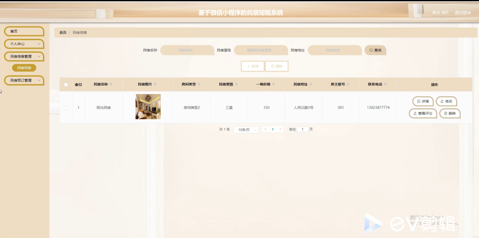 本系统的功能为民宿信息、公告信息、评论信息、预订信息、用户信息、收藏信息等。本系统包括管理员和用户、房主三种身份。
