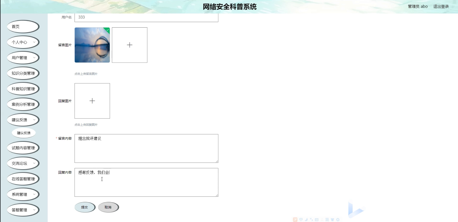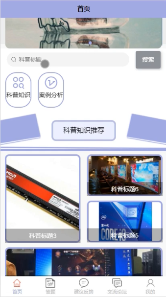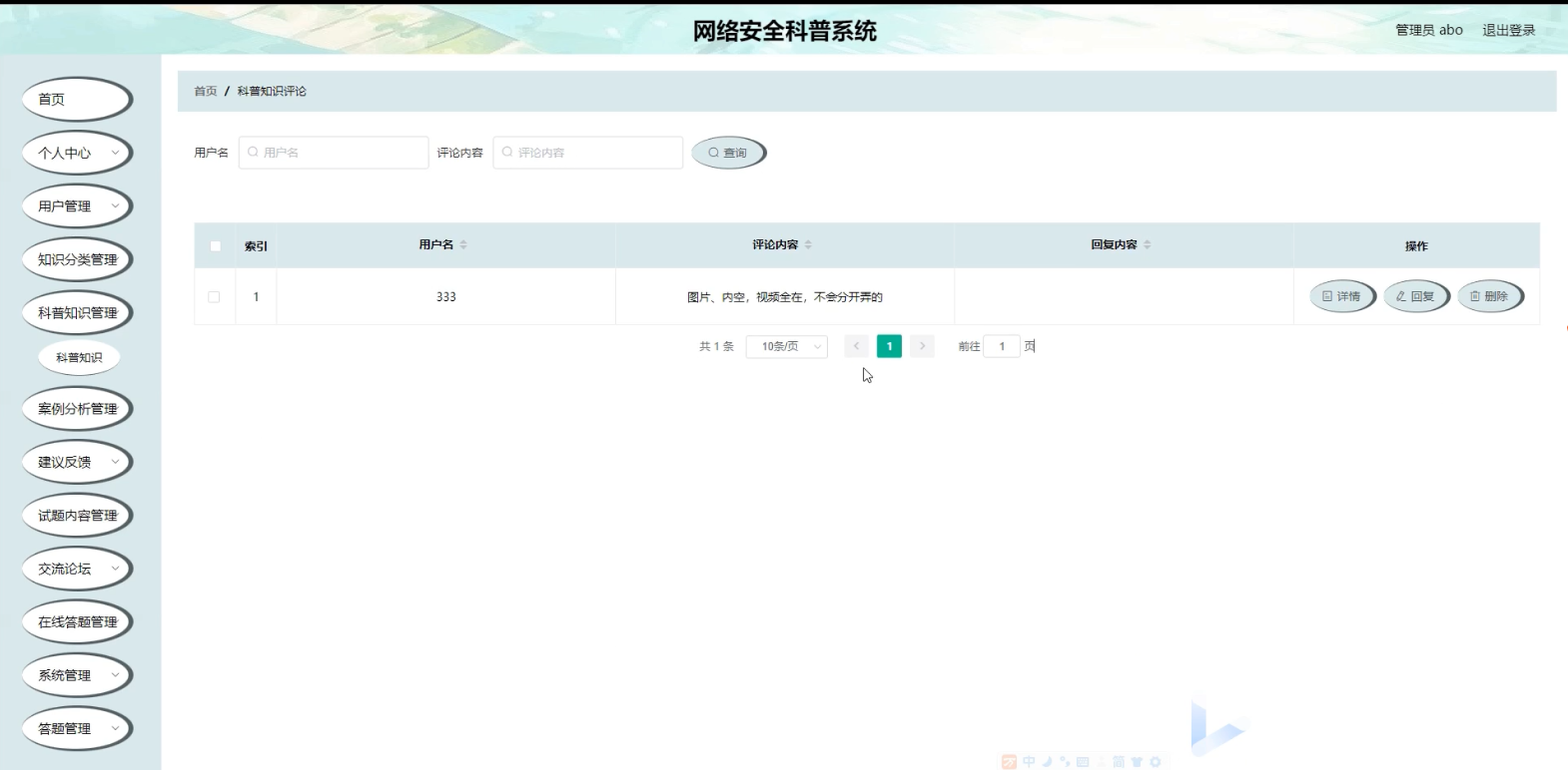 本系统的功能为科普知识管理、知识分类管理、案例分析管理、用户管理、反馈交流管理、答题管理等。本系统的权限分为用户和管理员两种。界面分为管理员界面和用户界面。