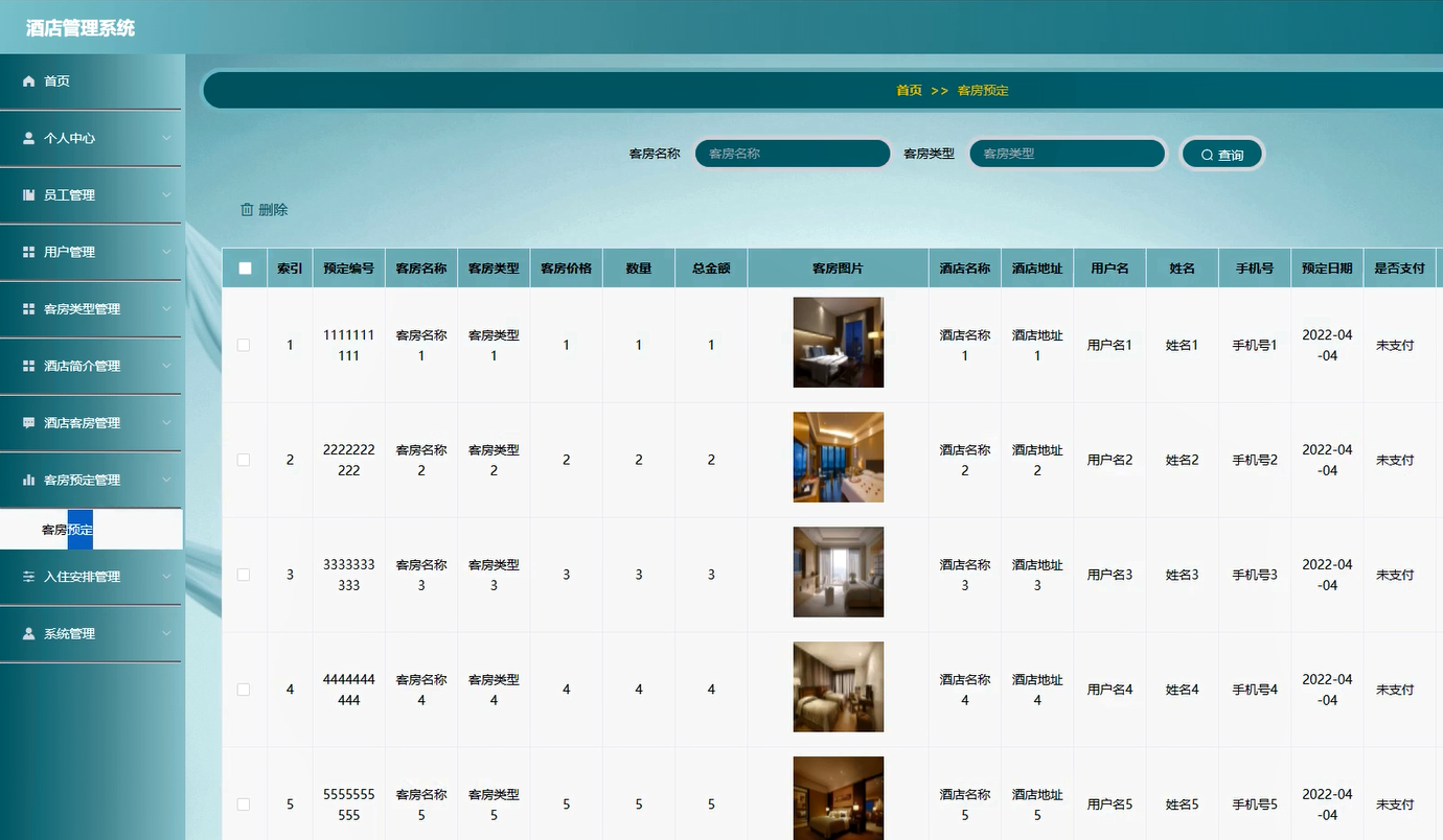 管理端功能有:员工管理、用户管理、客房类型管理、酒店简介管理、酒店客房管理、客房预定管理、入住安排管理、轮播图管理、系统管理等