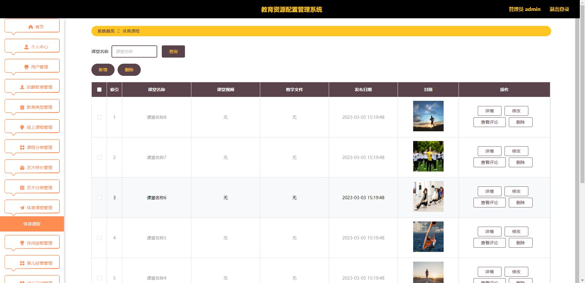 艺术分类管理、体育课程管理、休闲益智管理、育儿经营管理、成长日记管理、系统管理等功能。