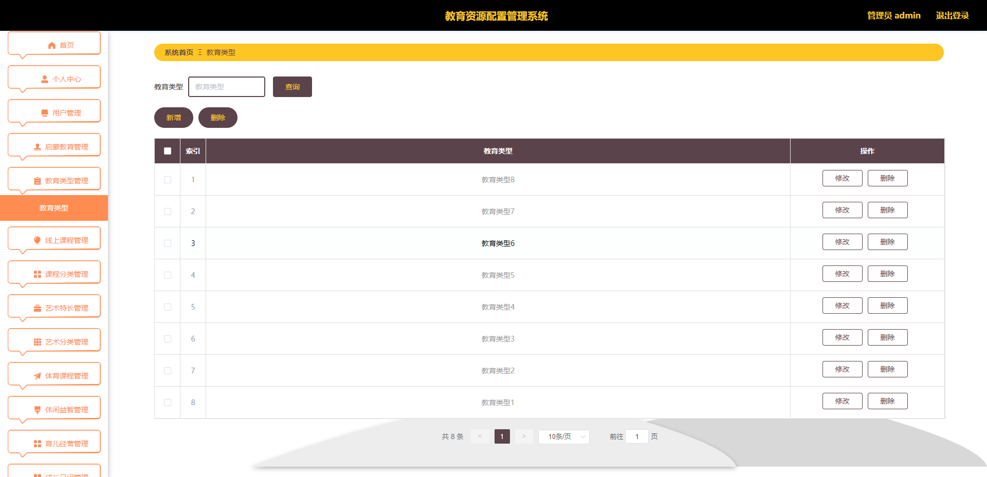 主要包含个人中心、用户管理、启蒙教育管理、教育类型管理、线上课程管理、课程分类管理、艺术特长管理、