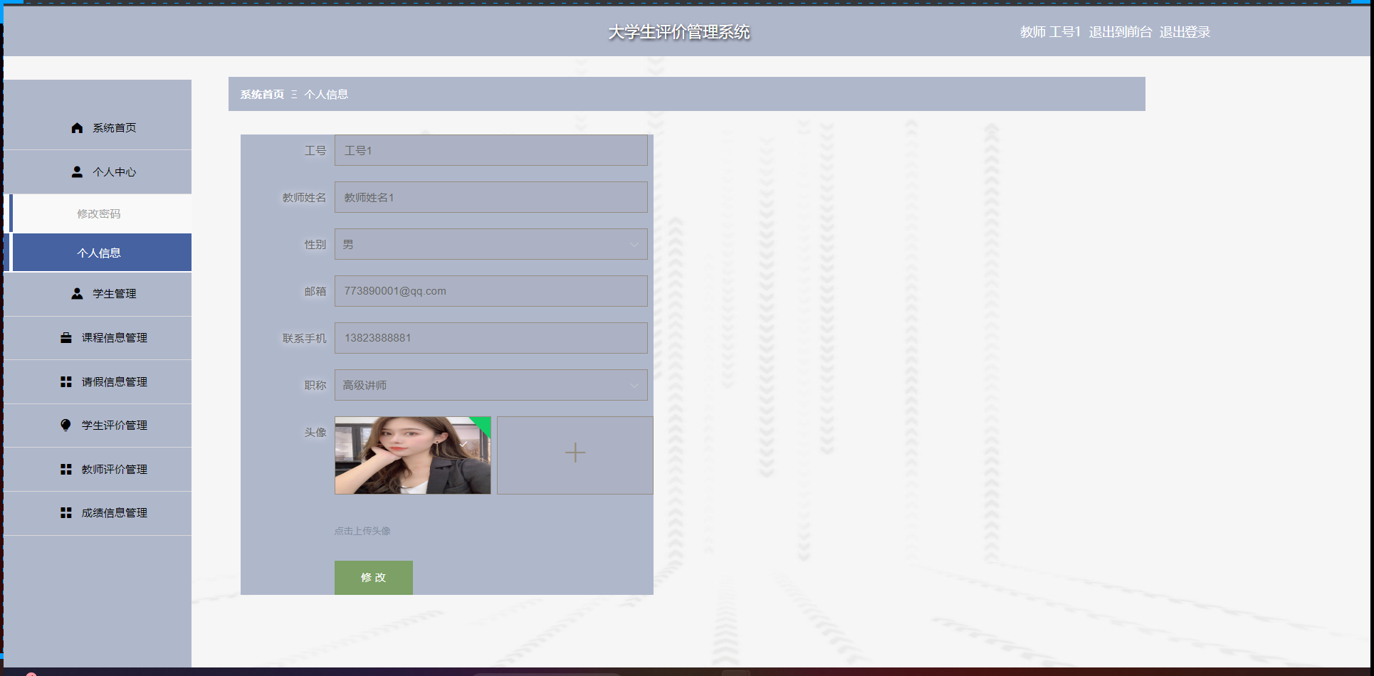 管理员功能首页,管理员登录系统后可以对个人中心,学生管理,教师管理,分类管理,课程信息管理,请假信息管理,评价类型管理,学生评价管理,教师评价管理,成绩信息管理,留言反馈,系统管理等功能进行相应的操作管理。