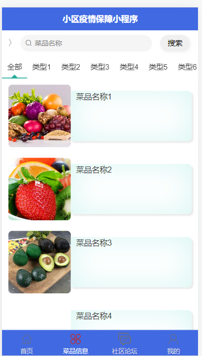 本系统以小区疫情报障管理为主题,利用不断发展和进步的网络技术,实现对个人信息修改、居民管理、护工管理、居民健康管理、护工健康管理、菜品信息管理、菜品分类管理、点菜信息管理、订单信息管理、外出申请管理、核酸预约管理、上门任务管理、小区论坛、系统管理等主要功能的管理。