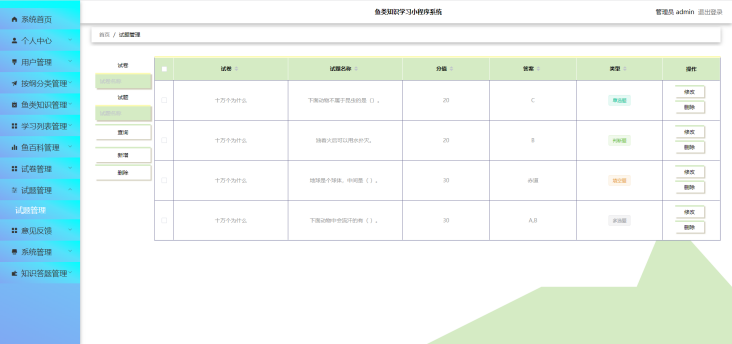 本系统以鱼类知识学习为主题,利用不断发展和进步的网络技术,实现对个人信息修改、用户管理、按岗分类管理、鱼类知识管理、学习列表管理、鱼百科管理、意见反馈、试卷管理、试题管理、系统管理、知识答题管理等主要功能的管理。