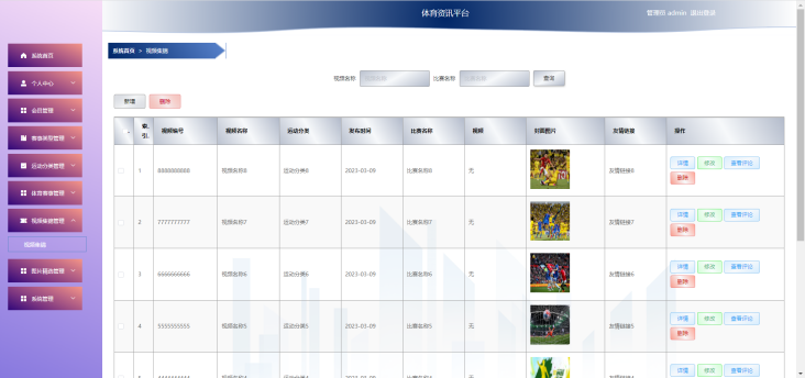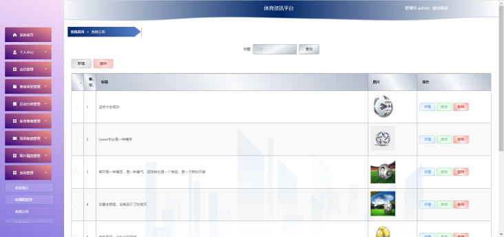 主要功能包括系统首页,个人中心,会员管理,赛事类型管理,运动分类管理,体育赛事管理,视频集锦管理,图片精选管理,系统管理等。