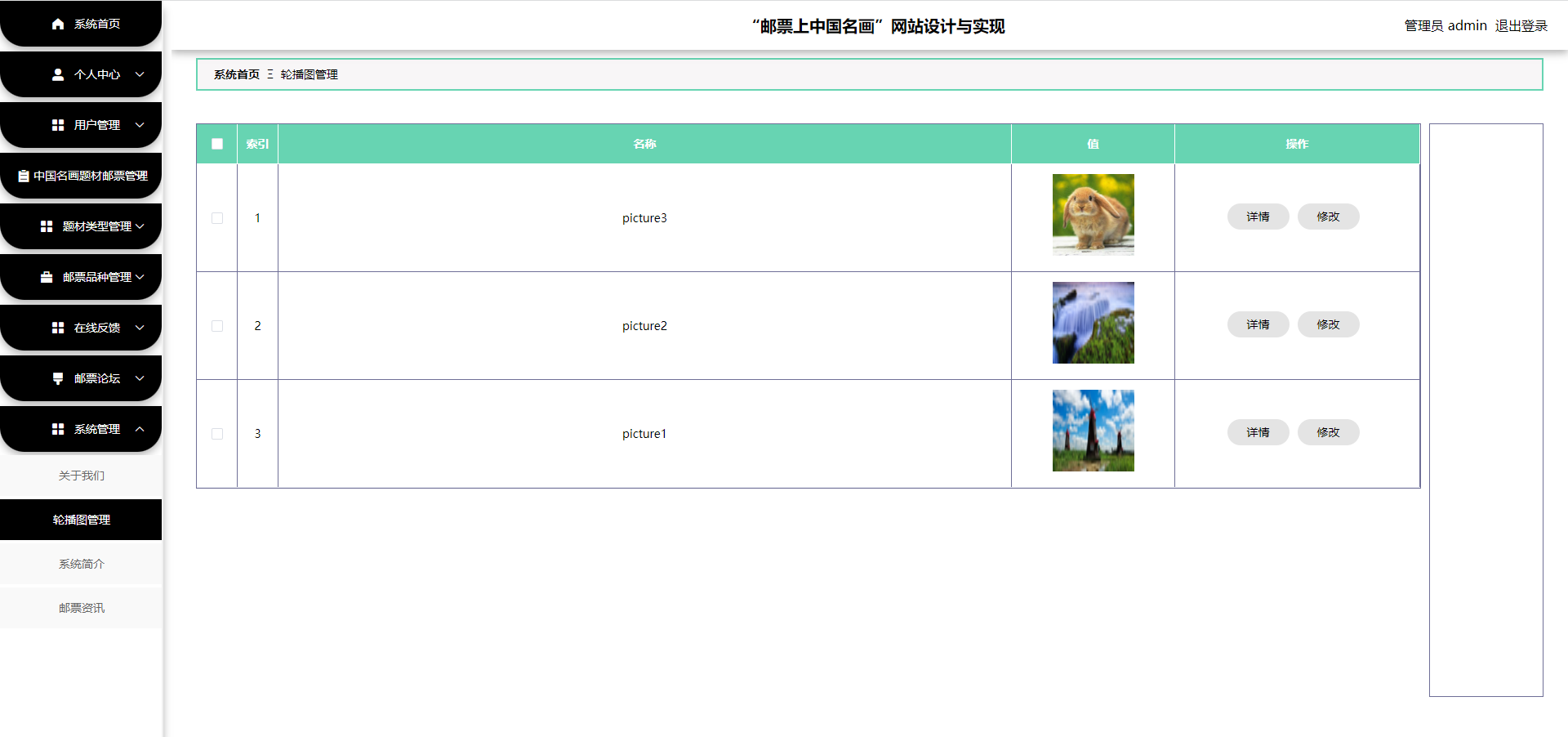 后台模快:首页、个人中心、用户管理、名画邮票邮票管理、题材类型管理、邮票品种管理、在线反馈、邮票论坛、系统管理