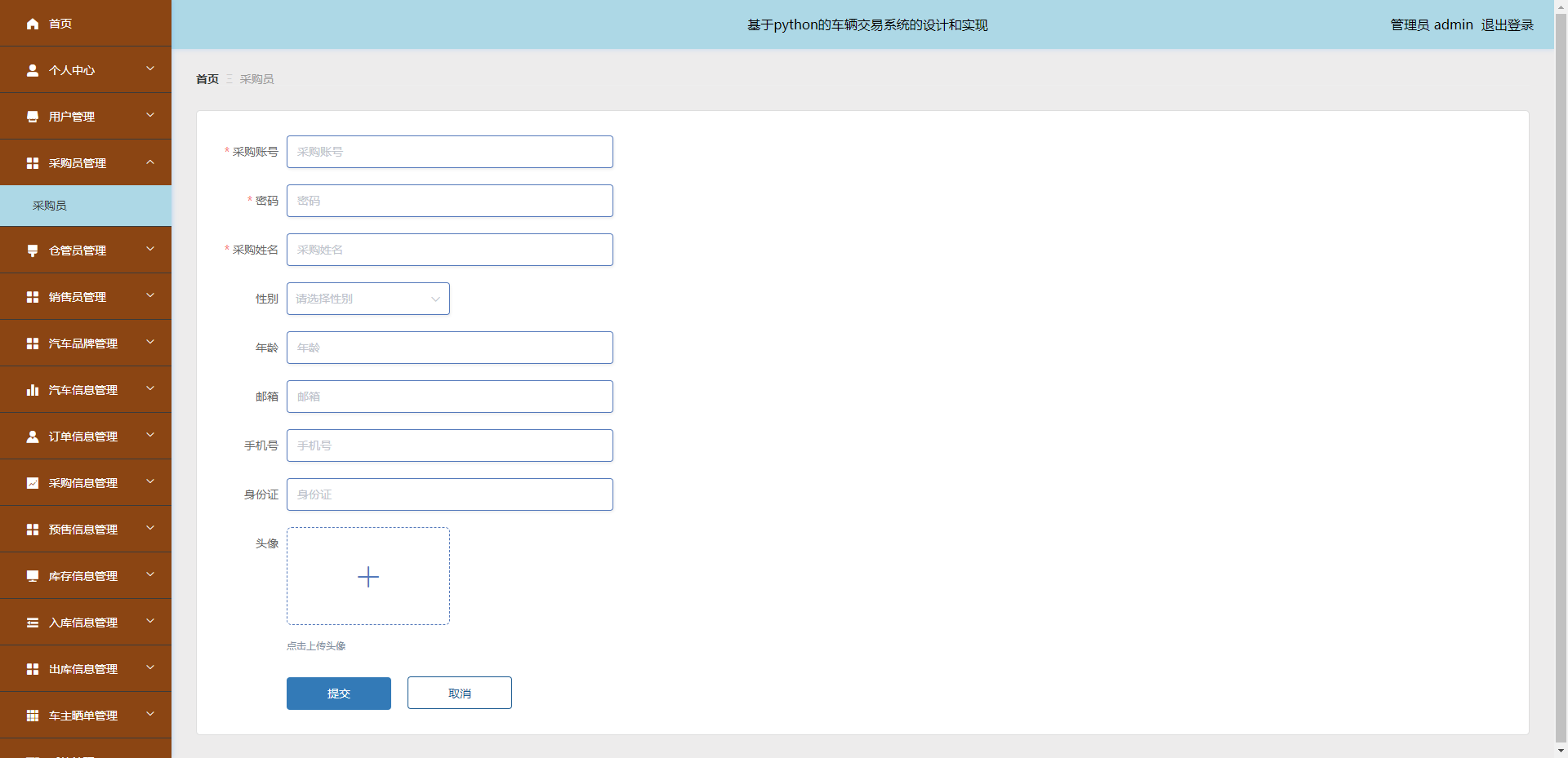后台模块:首页、个人中心、用户管理、采购员管理、汽车品牌管理、汽车信息管理、订单信息管理、出入库管理、系统管理等等