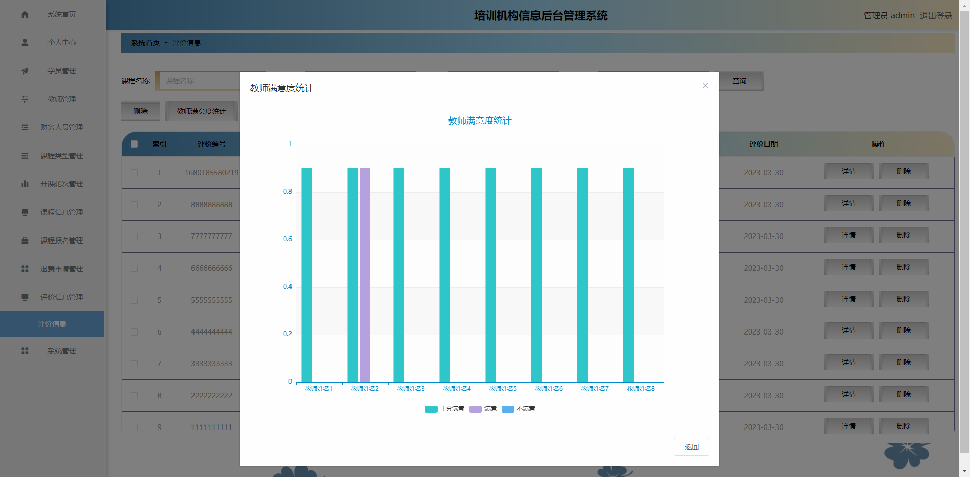 该系统主要实现了以下几个模块功能管理员、学员、教师、财务人员四个功能模块,其中学员模块主要实现了查看课程信息、课程报名管理、退费申请管理、评价信息管理等内容,并进行培训机构信息管理系统的操作;教师模块主要实现了添加课程信息、课程类型等功能,并浏览学员的课程报名和评价;管理员模块主要实现了对个人中心、学员管理、教师管理、财务人员管理、课程类型管理、开课轮次管理、课程信息管理、课程报名管理、退费申请管理、评价信息管理、系统管理管理等功能的管理。