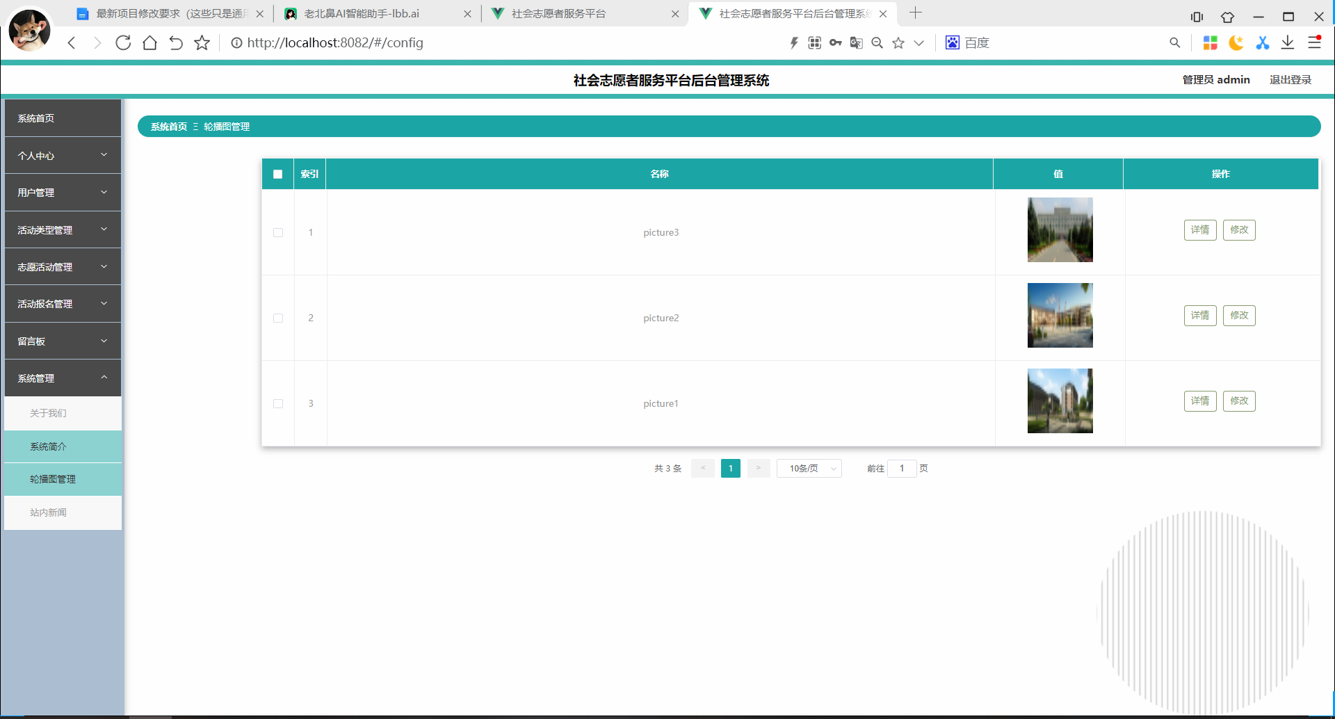 2、管理员功能模块包括:管理员的登录,首页,个人中心,站内新闻管理,志愿活动评论管理,留言管理,志愿活动管理,收藏管理。