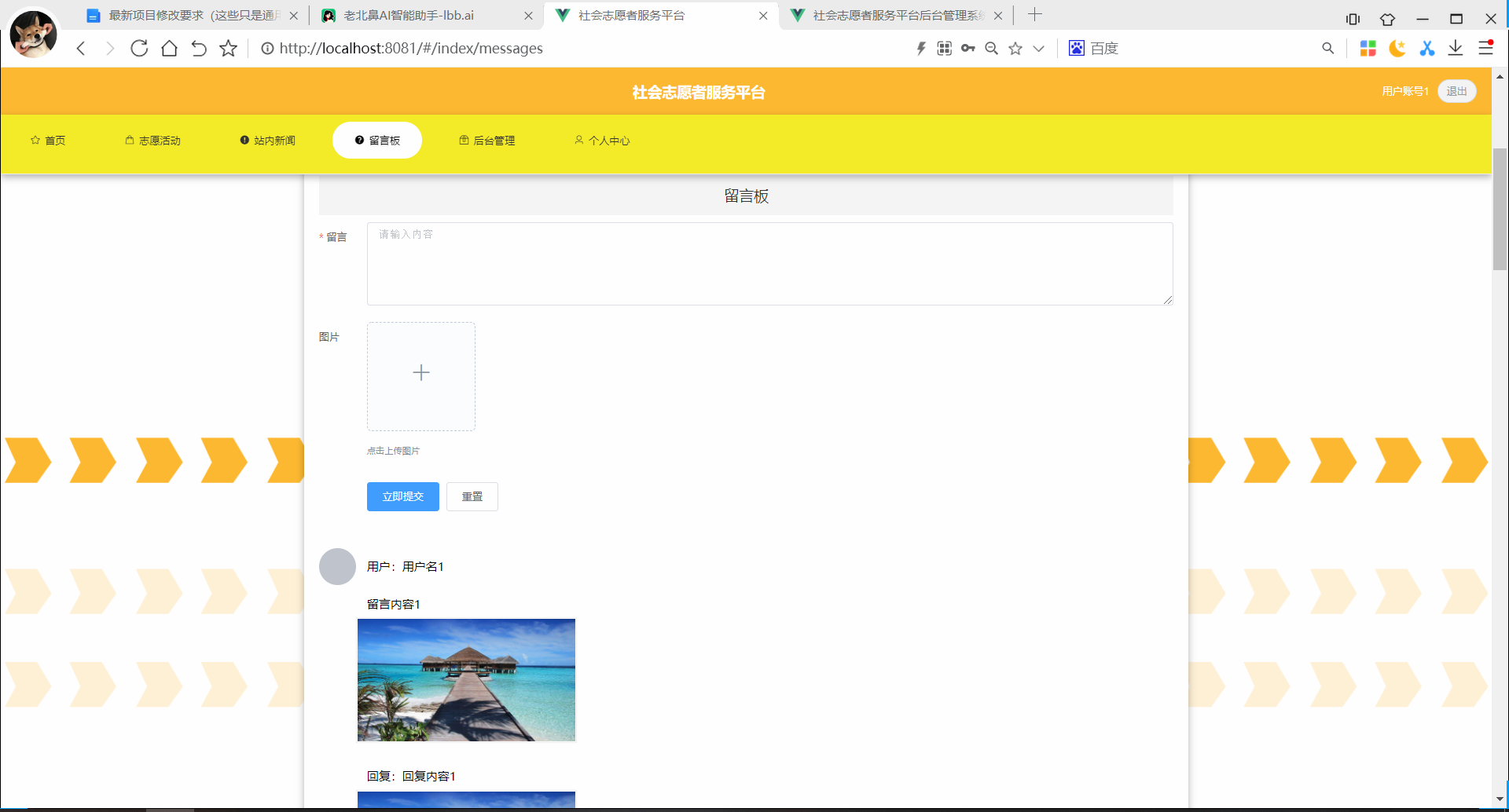 1、用户模块包括:登陆与注册,个人中心,留言板,志愿活动评论,收藏表,站内新闻,活动类型,报名活动。