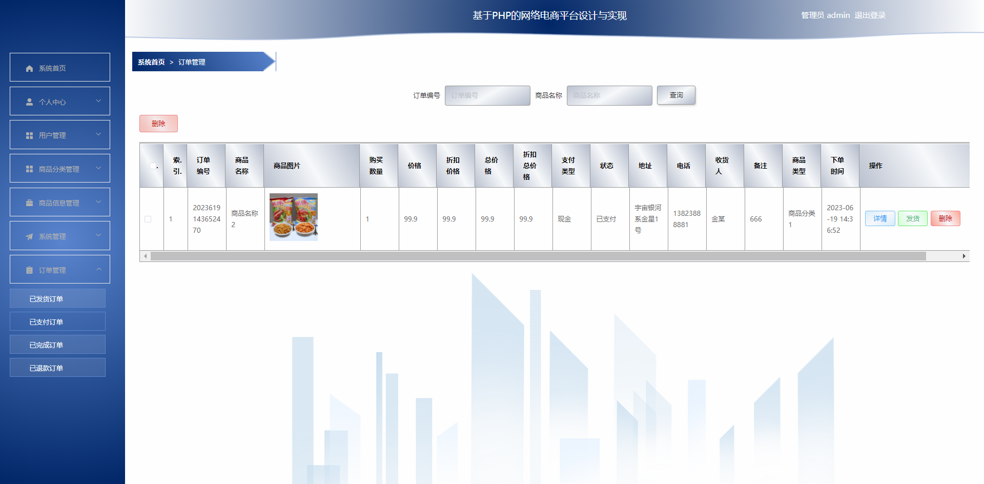 本系统主要设计并完成了对个人中心、用户管理、商品分类管理、商品信息管理、系统管理、订单管理等功能的管理。该系统操作简单,界面设计简单,不仅能基本满足目前网上商城管理的日常工作,而且能有效降低人员成本和时间成本,为网上商城管理工作提供方便。