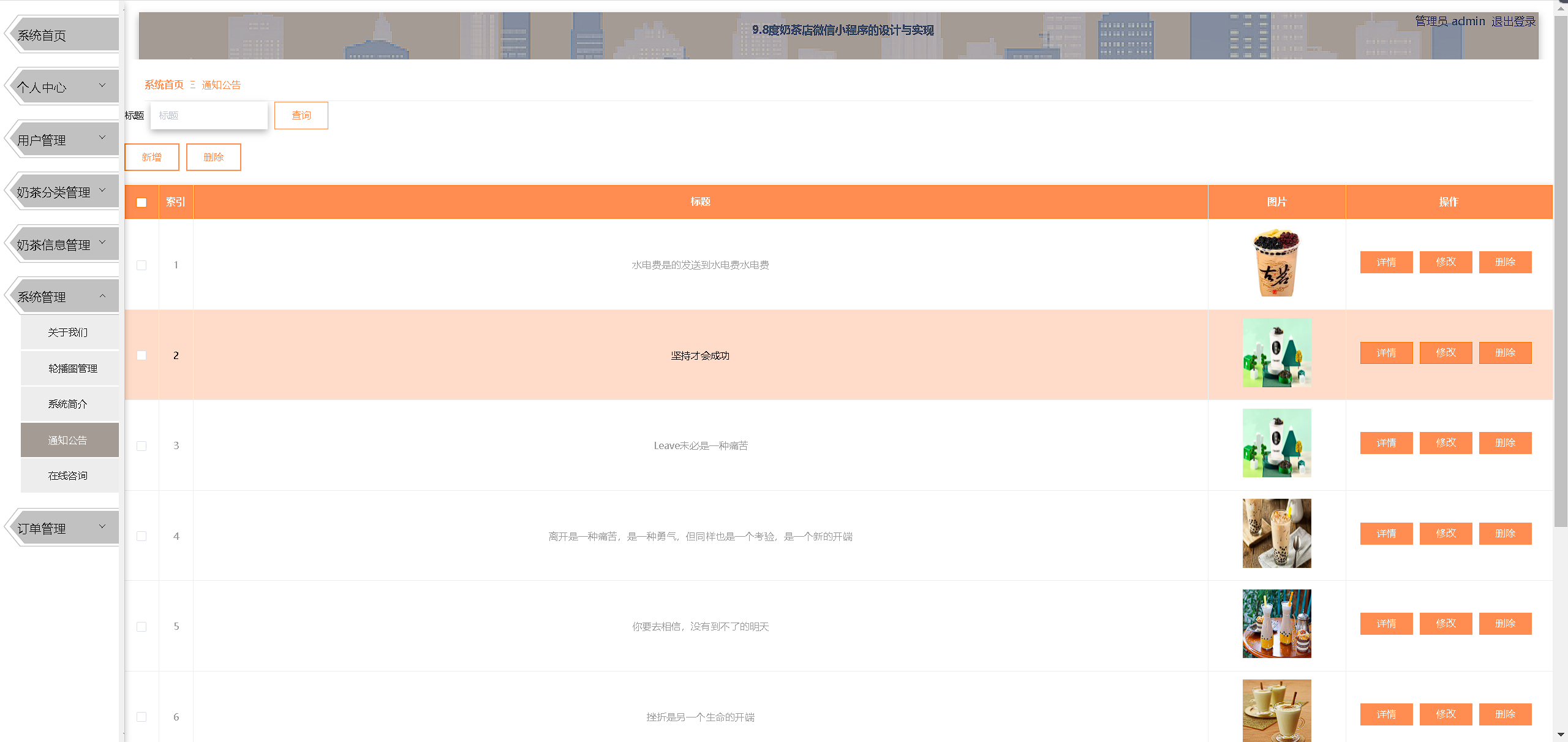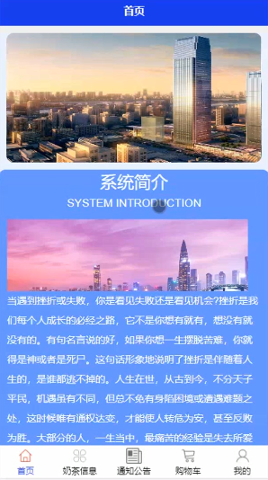 用户可以在主页留浏览首页,奶茶信息,通知公告,购物车,我的;注册登录后可以在我的页面对我的收藏管理,用户充值,在线咨询,购物车,我的订单等进行详细操作;管理员可通过后台管理界面管理用户信息。