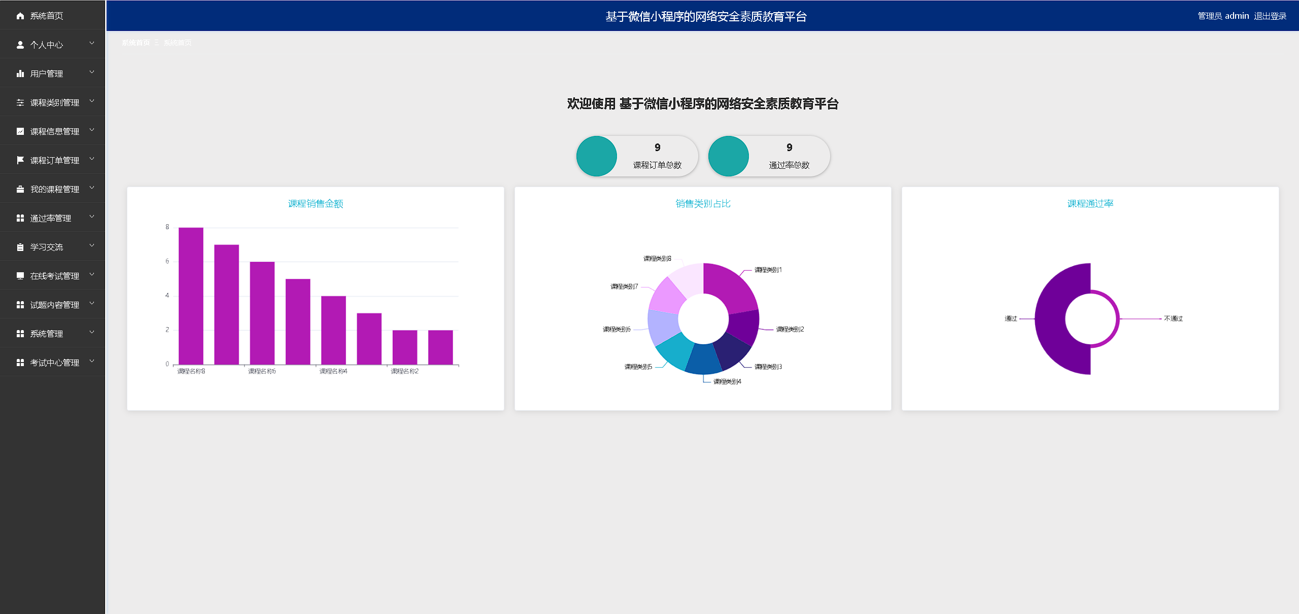 系统开发是基于nodejs语言编写实现,用Mysql数据库搭建存储闲置物品交易网的数据。系统主要包括系统首页、个人中心、用户管理、课程类别管理、课程信息管理、课程订单论坛、考试中心管理、试题内容管理、学习交流、系统管理、考试管理等功能,从而实现智能化的网络安全素质教育管理方式,提高网络安全素质教育管理的效率。