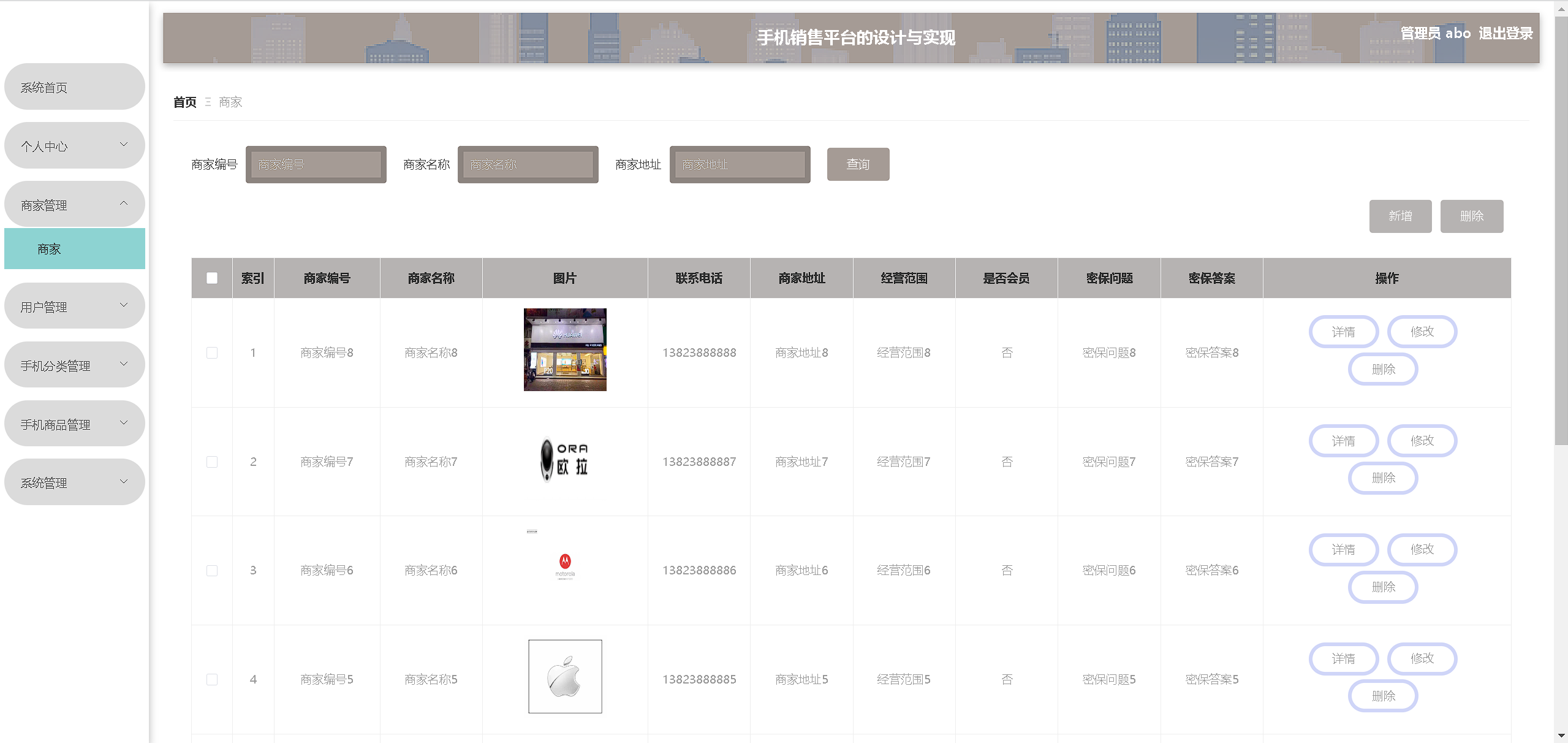 它是在Windows下,以MySQL为数据库开发平台,Node.js技术和Tomcat网络信息服务作为应用服务器。手机销售平台的功能已基本实现,主要包括个人中心、商家管理、用户管理、手机分类管理、手机商品管理、系统管理等功能的实现。