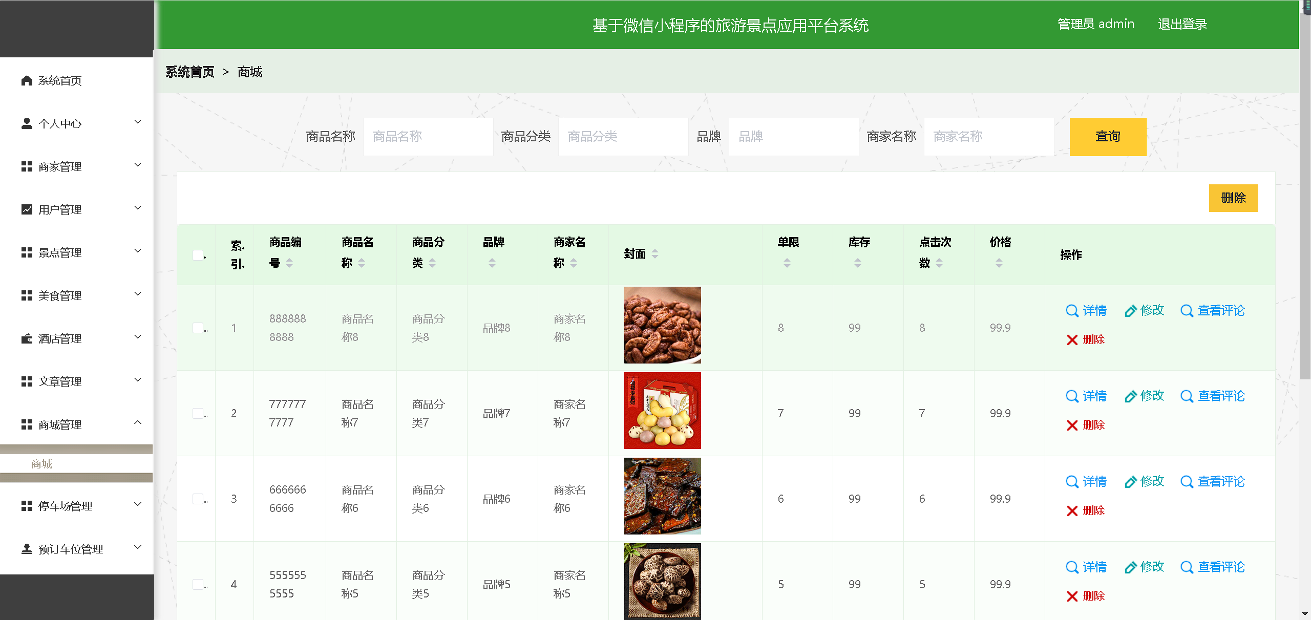 用户可以在主页留浏览首页,景点,购物车,我的;注册登录后可以在我的页面对停车场,预订车位,服务,我的收藏管理,用户充值,平台客服,购物车,我的订单等进行详细操作;商家进入系统后台可以对首页,个人中心,景点管理,美食管理,酒店管理,商城管理,停车场管理,预订车位管理,服务管理,订单管理等进行操作;管理员可通过后台管理界面管理商家和用户信息。