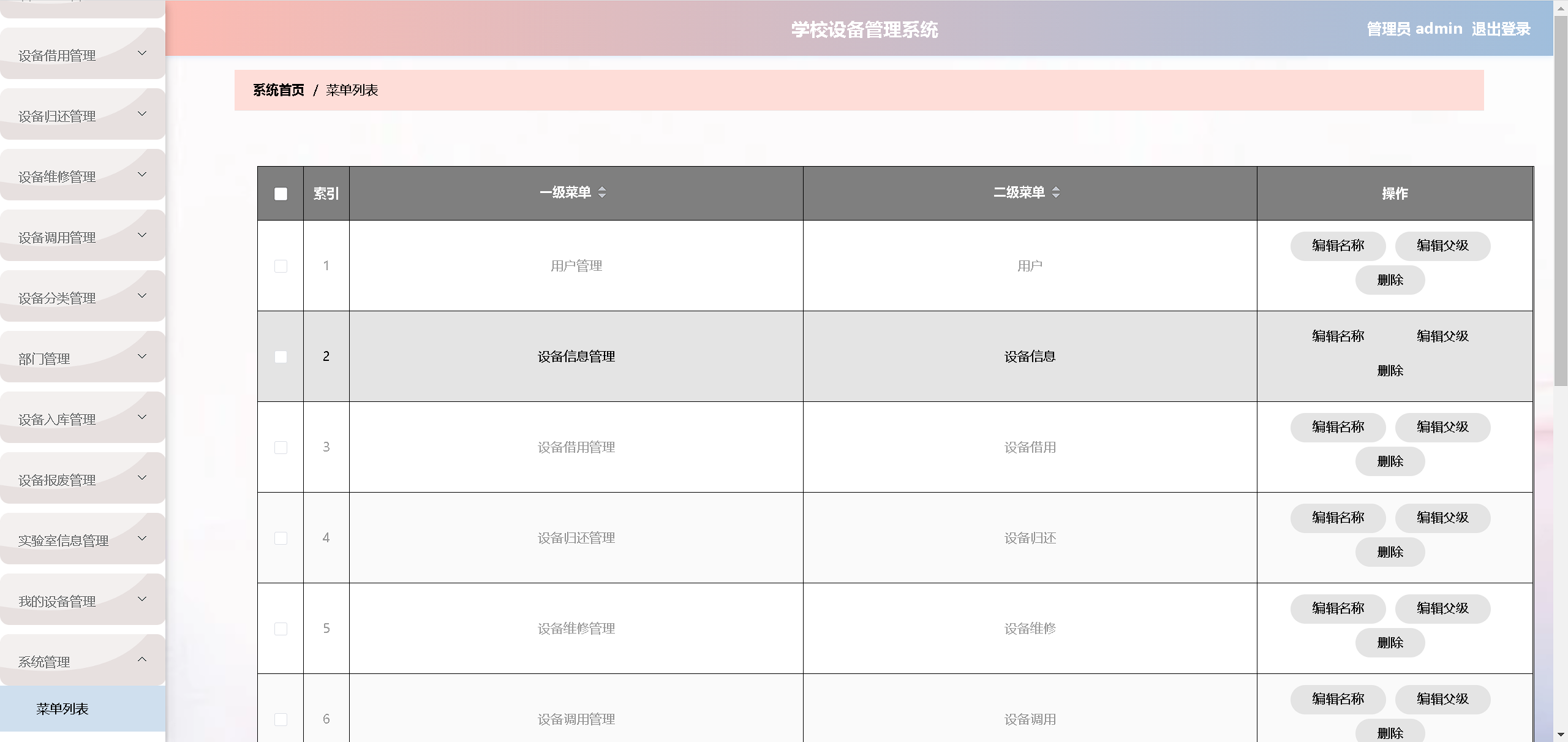 学校设备管理系统设计与实现采用B/S架构,数据库是MySQL。系统的搭建与开发采用了先进的NODEJS进行编写,使用了vue框架。该系统从两个对象:由管理员和用户来对系统进行设计构建。主要功能包括:个人信息修改,对用户管理,设备信息管理,设备借用管理,设备归还管理,设备维修管理,设备调用管理,设备分类管理,部门管理,设备入库管理,设备报废管理,实验室信息管理等功能进行管理。本系统在一般学校设备管理系统是一个高效的、动态的、交互友好的系统。