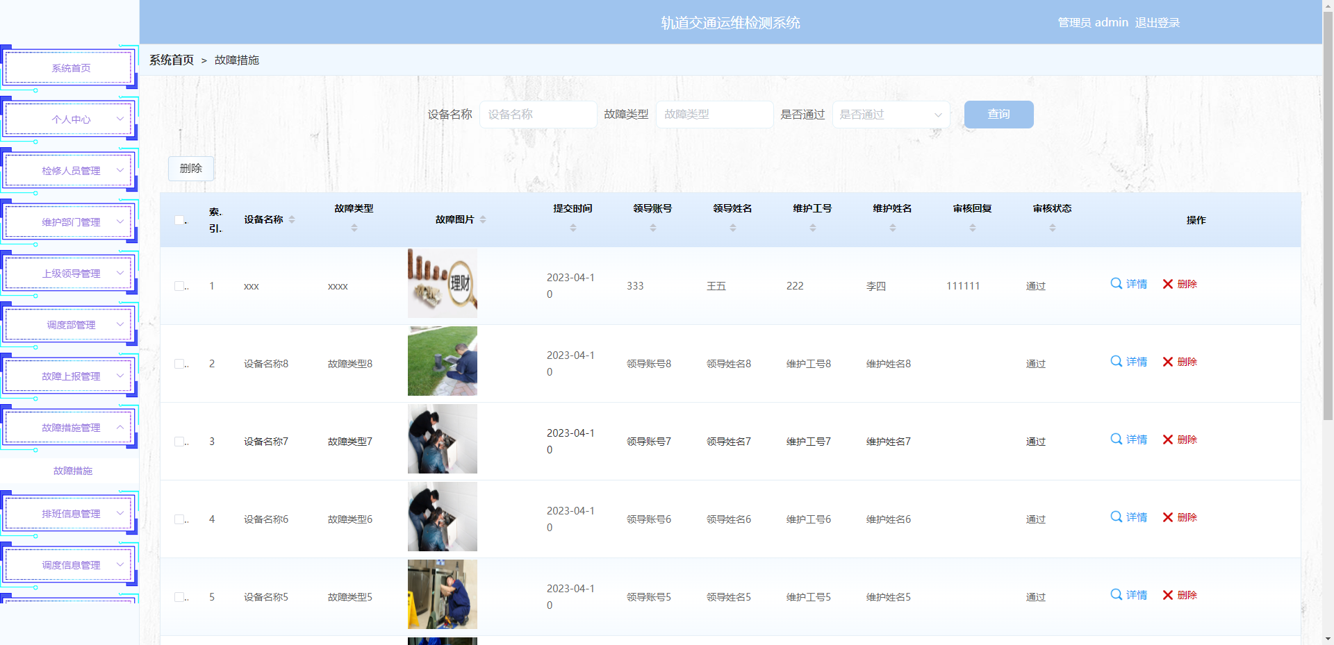 该系统采用NODEJS技术开发,后台使用MySQL数据库进行数据存储。 系统主要分为如下模块:即管理员模块,检修人员模块,维护部门模块,上级领导模块和调度部模块、调度模块、故障上报、系统管理、个人中心等。本文从轨道交通运维检测流程分析入手,分析了其功能性需求和非功能性需求,设计了一个由管理员,检修人员,维护部门,上级领导和调度部五部分组成的轨道交通运维检测系统。用户可以在主页留浏览首页,我的;管理员可通过后台管理界面管理用户信息。下面是系统运行起来后的一些截图: