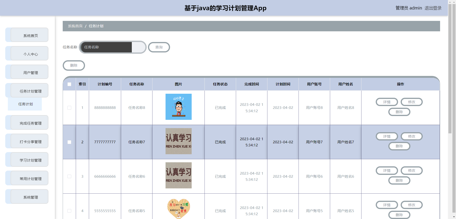 本文拟采用Android平台进行开发,使用java技术和Springboot 搭建系统框架,后台使用MySQL数据库进行信息管理,设计开发的学习计划。通过调研和分析,系统拥有管理员和用户两个角色,主要具备登录注册、个人信息修改、用户管理、任务计划管理、完成任务管理、打卡分享管理、学习计划管理、常用计划管理、系统管理等功能模块。将纸质管理有效实现为在线管理,极大提高工作效率。