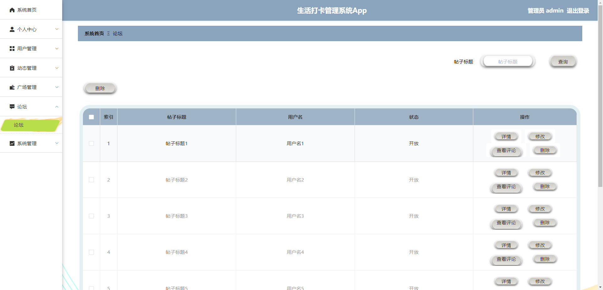 系统主要包括系统首页、个人中心、用户管理、动态管理、广场管理、论坛、系统管理、新闻资讯等功能,从而实现智能化的生活打卡管理方式,提高生活打卡管理的效率。