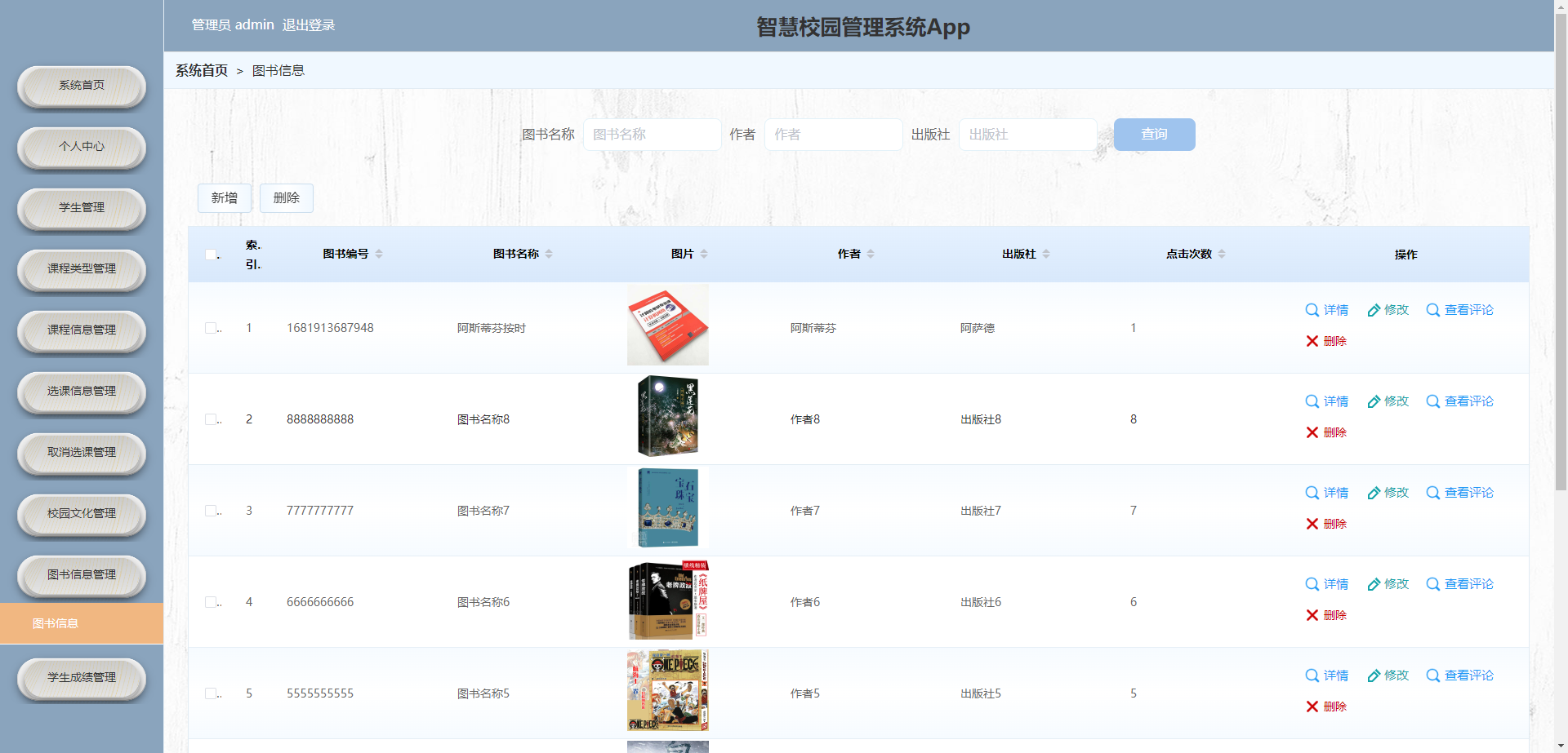 管理员可通过后台管理界面管理学生信息和系统管理、课程类型管理、课程信息管理、服务办理管理、后勤服务管理、图书信息管理、校园文化管理、选课信息管理等