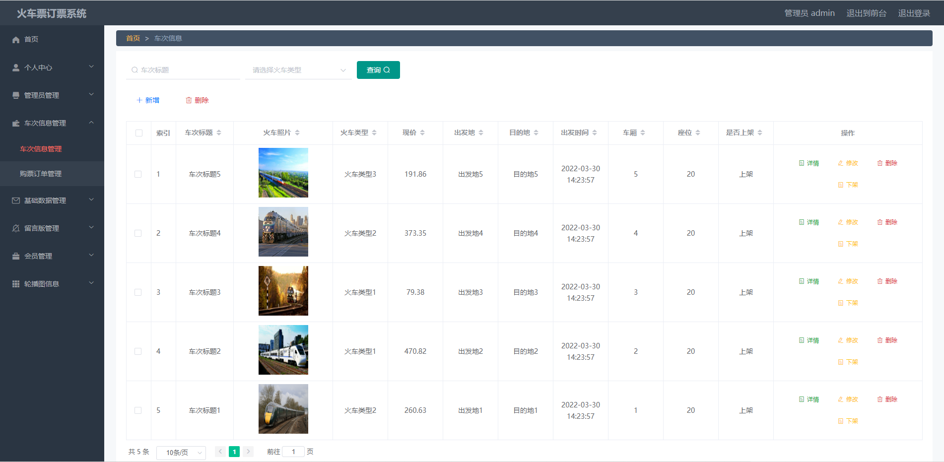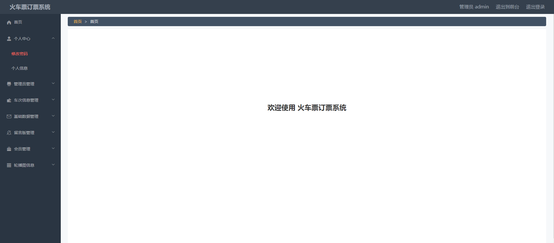 管理端功能有:个人中心、车次信息管理、基础数据管理、留言版管理、会员管理、系统管理。