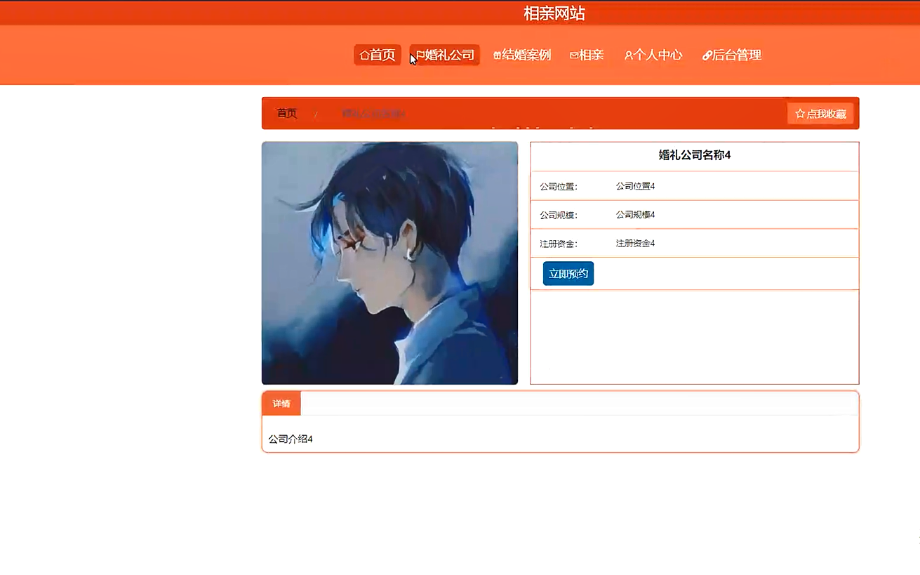 用户端功能有:首页、婚礼公司介绍、结婚案例、用户介绍、相亲预约、个人中心