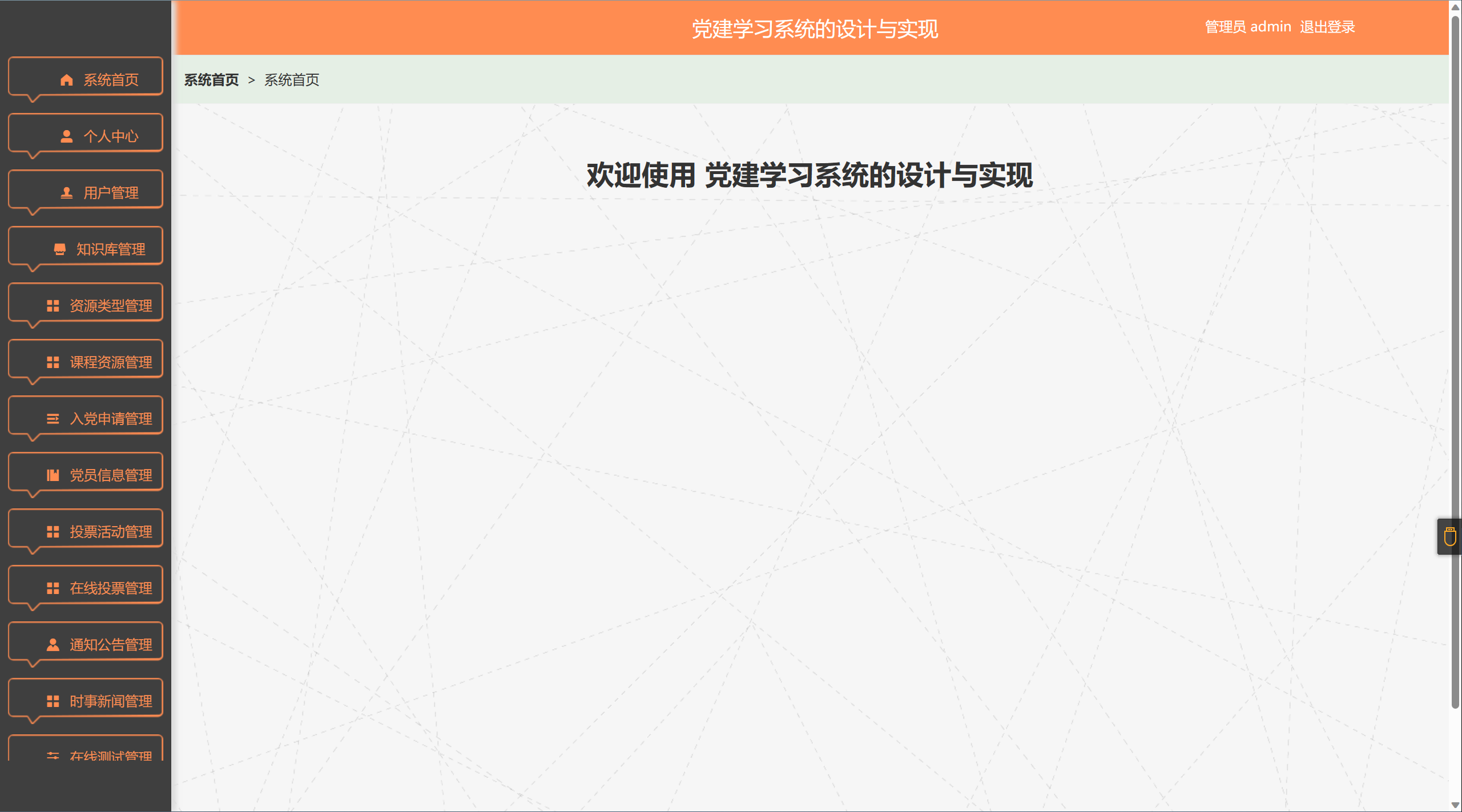 主要涵盖了个人中心、用户管理、知识库管理、资源类型管理、课程资源管理、入党申请管理、党员信息管理、投票活动管理、在线投票管理、通知公告管理、时事新闻管理、答题题库管理、在线测试管理、系统管理、在线答题管理等功能,采用该党建学习系统将满足管理员和用户日常管理工作的基本需求。
