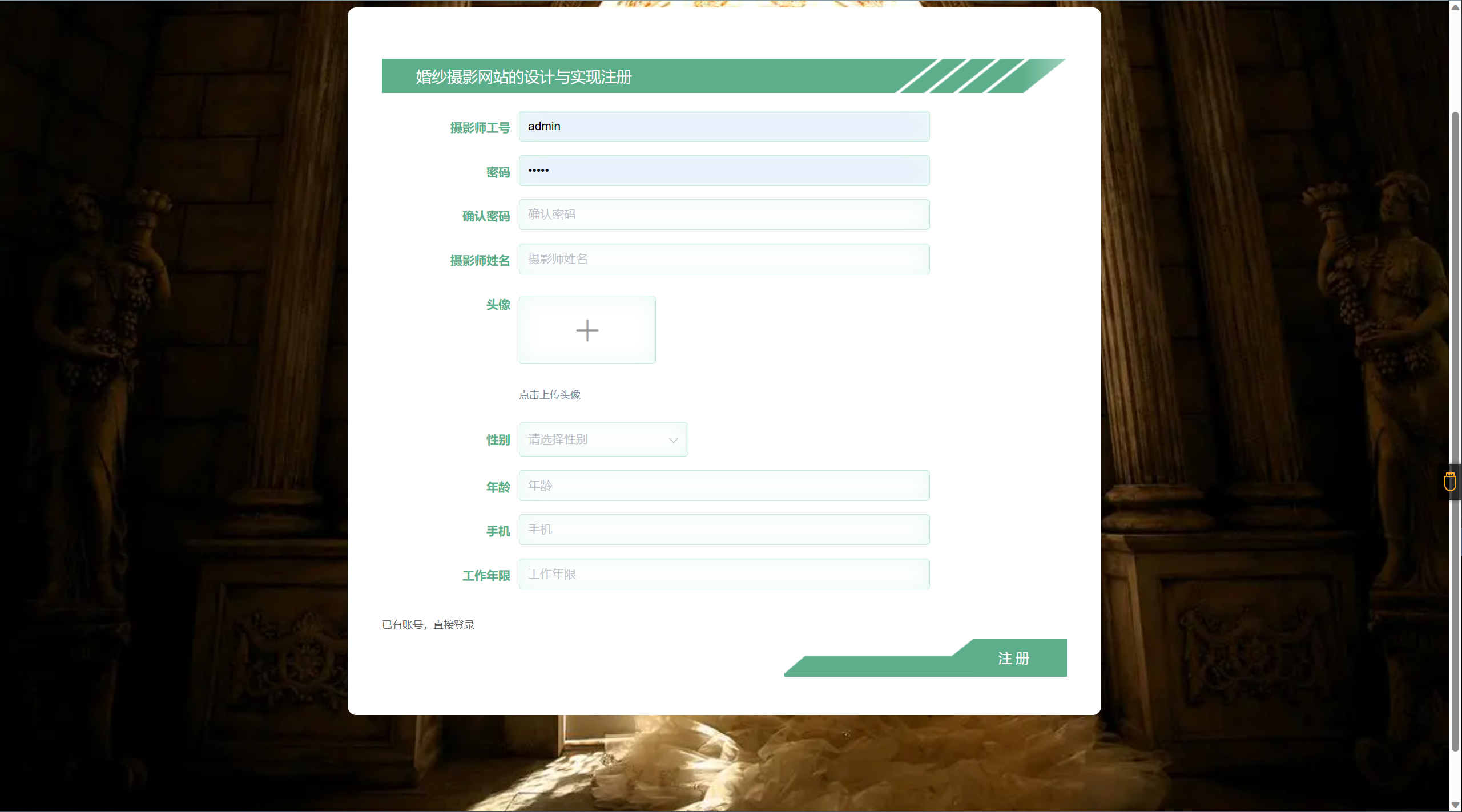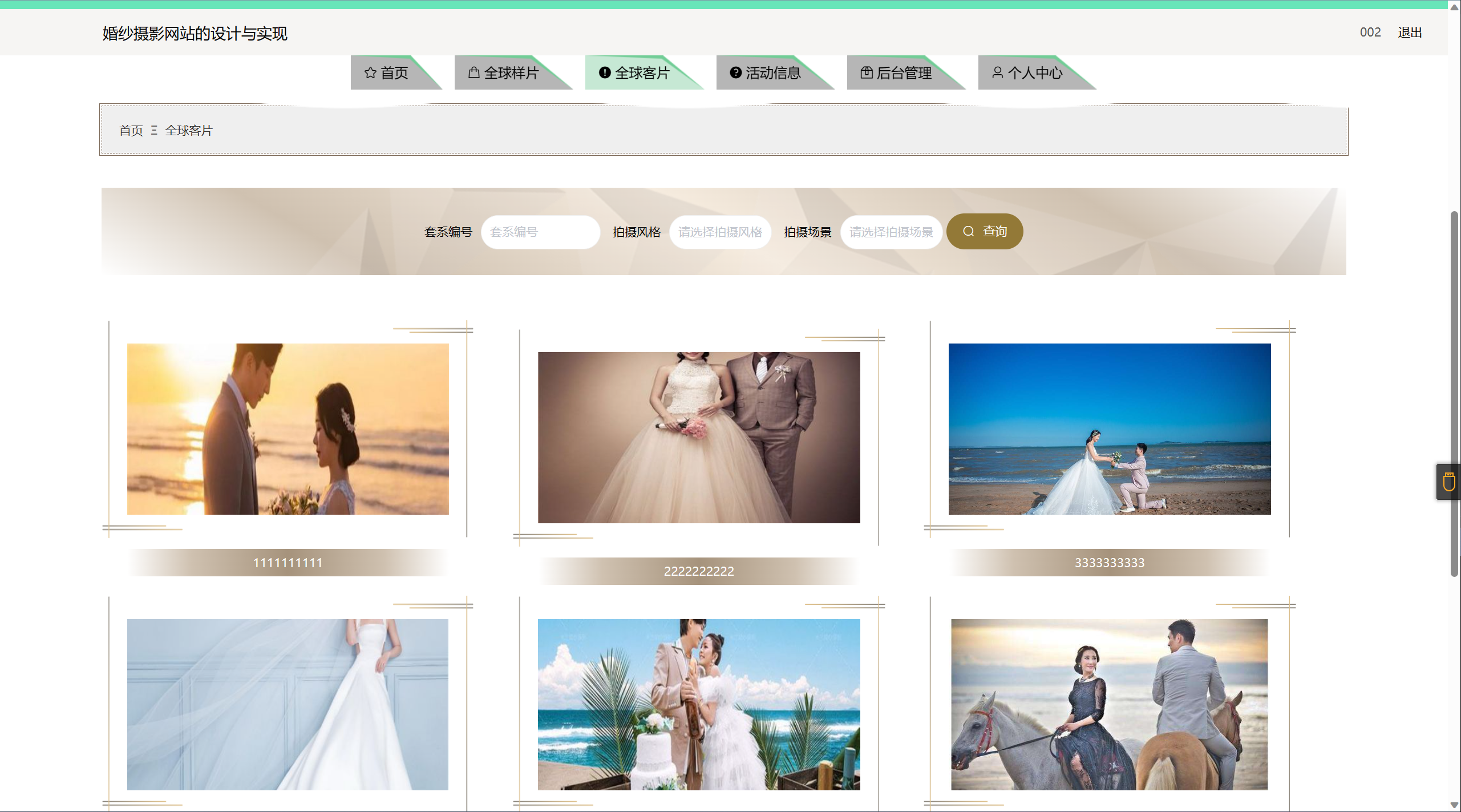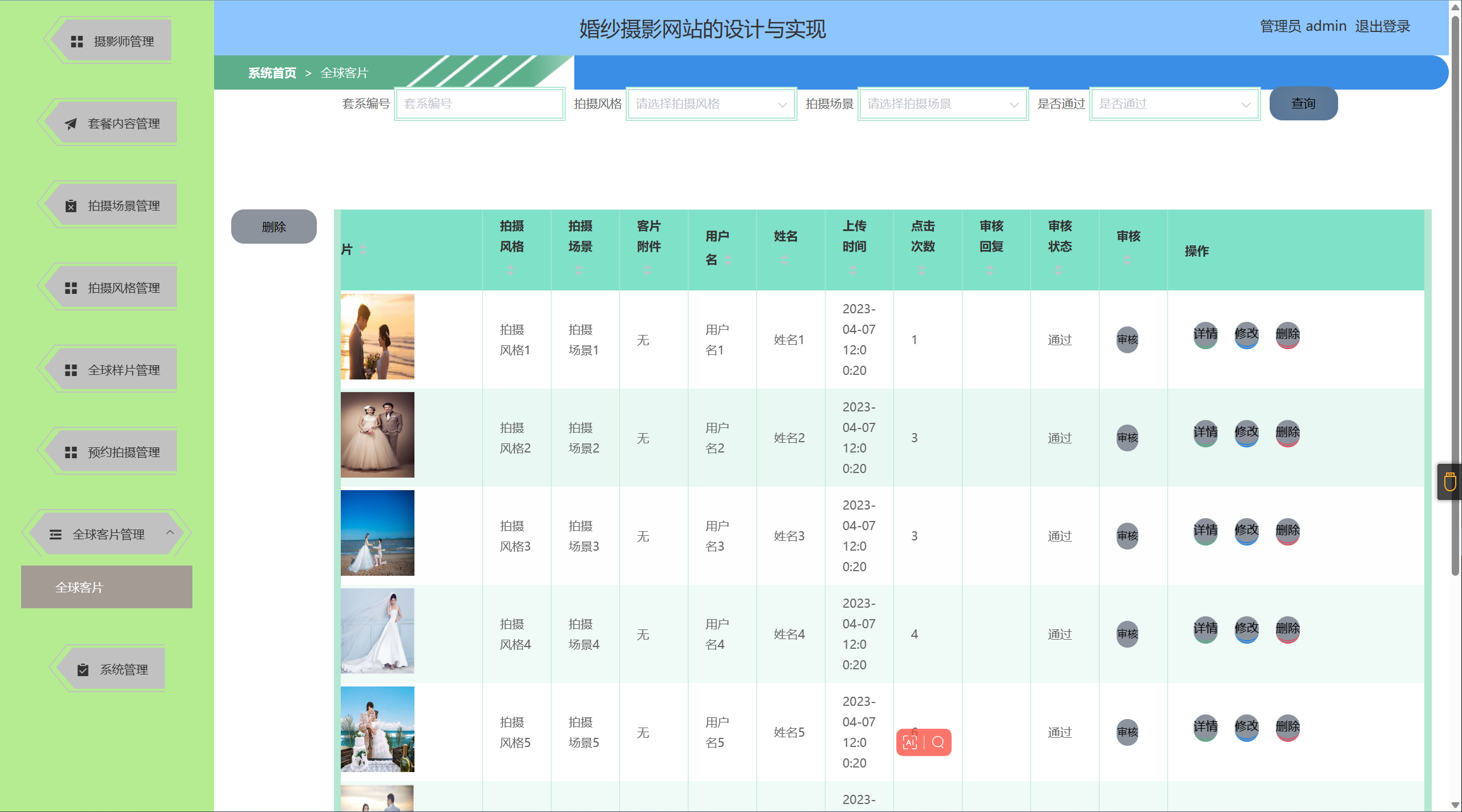 管理人员需要做的就是将数据输入到系统的数据库中去。经过分析,本系统选择java技术,运用了MySQL为后台数据库,将网站分为管理员、摄影师和用户这三大类,系统实现了个人中心、用户管理、摄影师管理、套餐内容管理、拍摄场景管理、全球样片管理、预约拍摄管理、全球客片管理、系统管理等必需的功能,除此以外还加入了一些增加使用体验的功能。其操作简单,界面友好,运行比较稳定,适用于婚纱摄影的管理。